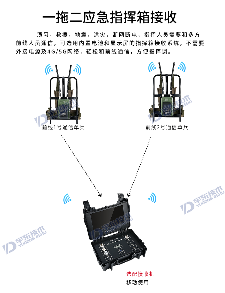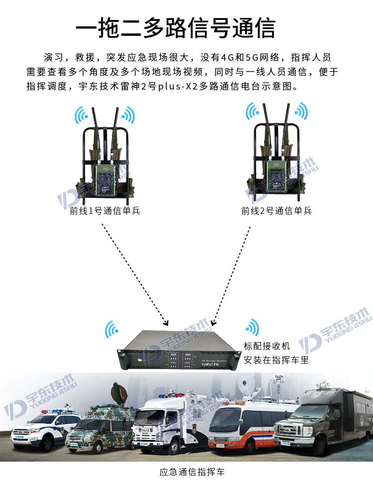 宇東技術雷神2號plus-X2一拖二背負式高清無線圖傳電臺,是應對突發事故,斷網斷電,如地震、洪災、反恐、應急救援、部隊演習等使用通信,本設備由4路背負式單兵發射機電臺和1臺四路接收于一體的接收電臺地面指揮箱組成,指揮箱自帶四路接收模組和顯示器及功能按鍵,可同時接收四路發射機的視頻和對講信號數據,指揮箱自帶揚聲器,可接收DV無線發送現場的聲音數據。支持擴展HDMI外接顯示大屏及插USB錄像保存功能,真正義意上做到及時取證,錄像保存,移動通信,統計指揮調度等。